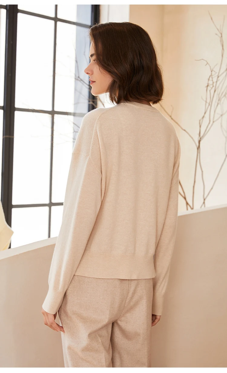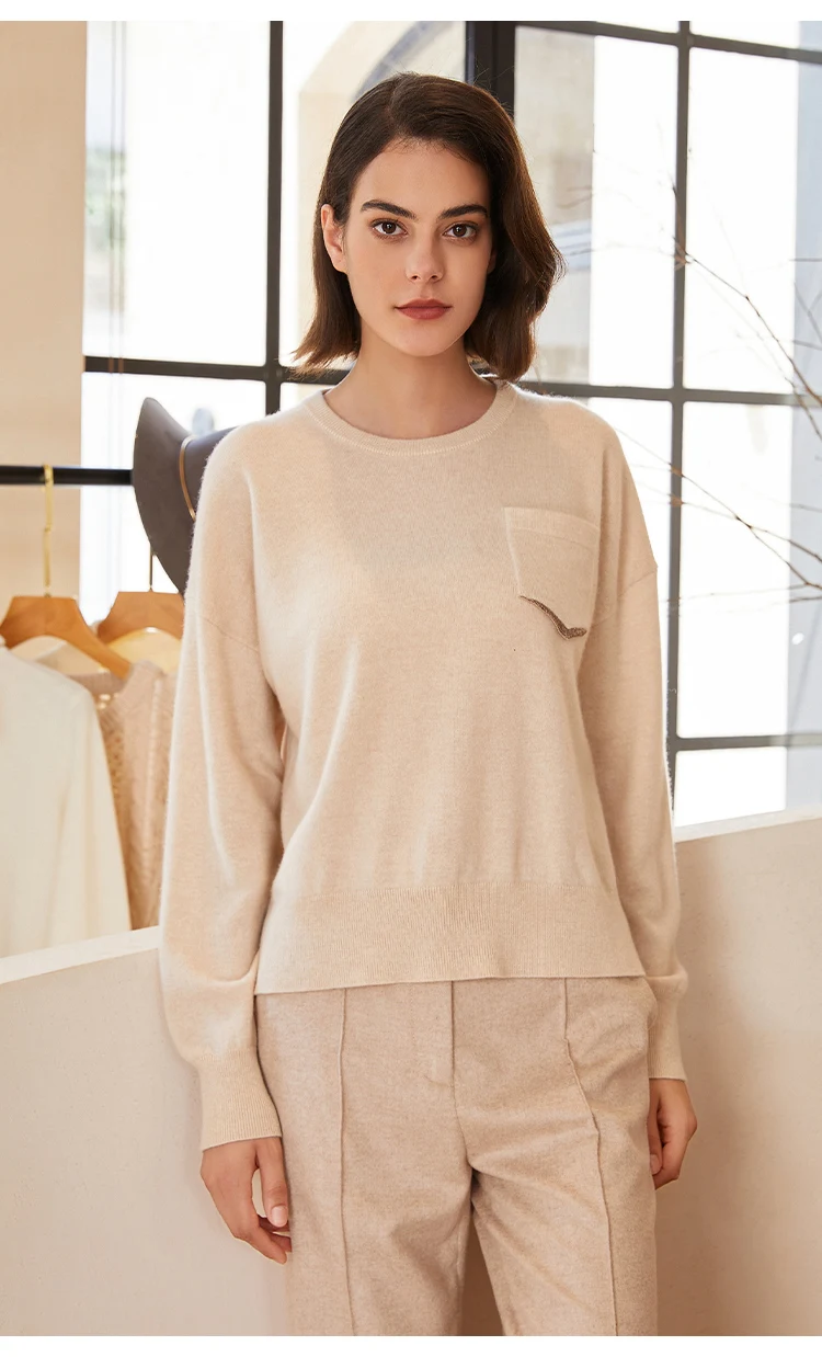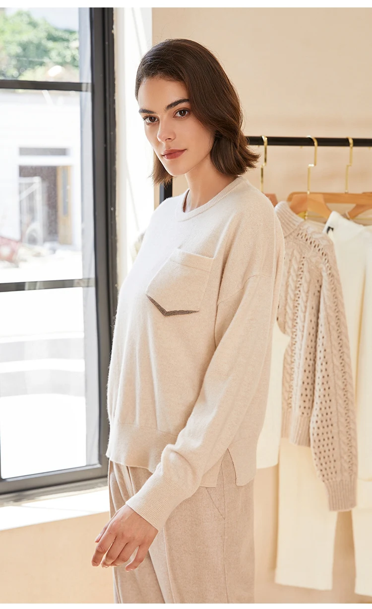 whether full opening:No Hign-concerned Chemical:None Release Date:Autumn 2025 Craft of Weaving:Knit Pattern:SLIM Yarn Thickness:Fine yarn Percentage of Material:95% above Season:Autumn/Winter Age:25-34 Fabric Weight:Medium (Fabric Weight 120–220 g/m²) Model Number:23BC-311 Place Of Origin:China (mainland) Pattern Type:Solid Gender:Women Sleeve Length(cm):Full Style:Casual Decoration:Beading Material:CASHMERE Sleeve Style:regular Collar:O-Neck Clothing Length:regular Material Composition:100% Cashmere Brand Name:Serathinan Closure Type:None Elasticity:Slight Strech Fit Type:Loose